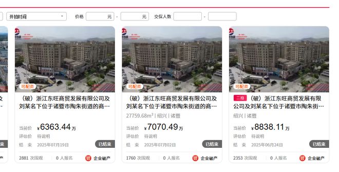 9月11日,在阿里拍卖上,浙江诸暨市再次迎来了一宗重量级的房地产拍卖,一宗浙江东旺商贸发展有限公司及刘某名下位于诸暨市陶朱街道的商业房地产及相关资产再次被拍卖。此次拍卖,跟公司破产有关,浙江东旺商贸发展有限公司已经破产了。浙江东旺商贸发展有限公司也算是诸暨市曾经的一家老商贸公司了,成立于1993年,经营范围包括批发、零售:纺织品、服装及日用百货、五金交电、家用电器、电子产品、机械设备、建材等,可惜已经破产了。